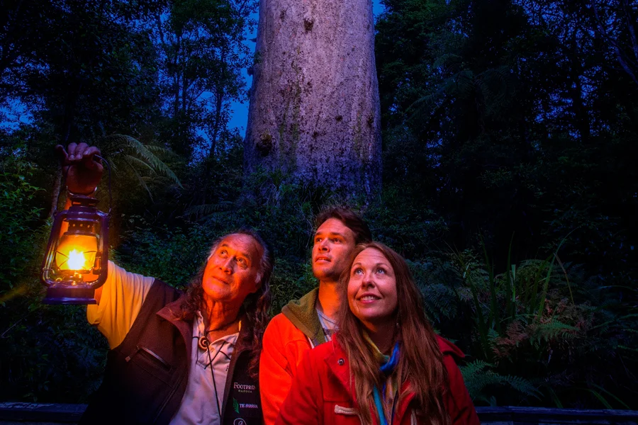 Finishing the day off with a magical experience and one that gets continuous rave reviews. The Award-winning Footprints Waipoua Forest Twilight walk. Your guide will share thought-provoking information, humorous banter, stories and legends before respectfully greeting the oldest and largest known kauri trees in the world with spine-tingling chants and song. Be mesmerised by Te Matua Ngāhere -The Father of the Forest; who at 3,000 years is the oldest giant. Be Enchanted by the largest giant, Tane Mahuta, a national icon